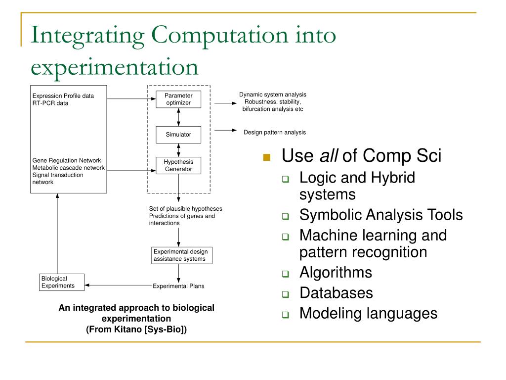 Integrating Computation into experimentation • Use all of Comp Sci • Logic and Hybrid systems • Symbolic Analysis Tools • Machine learning and pattern recognition • Algorithms • Databases • Modeling languages