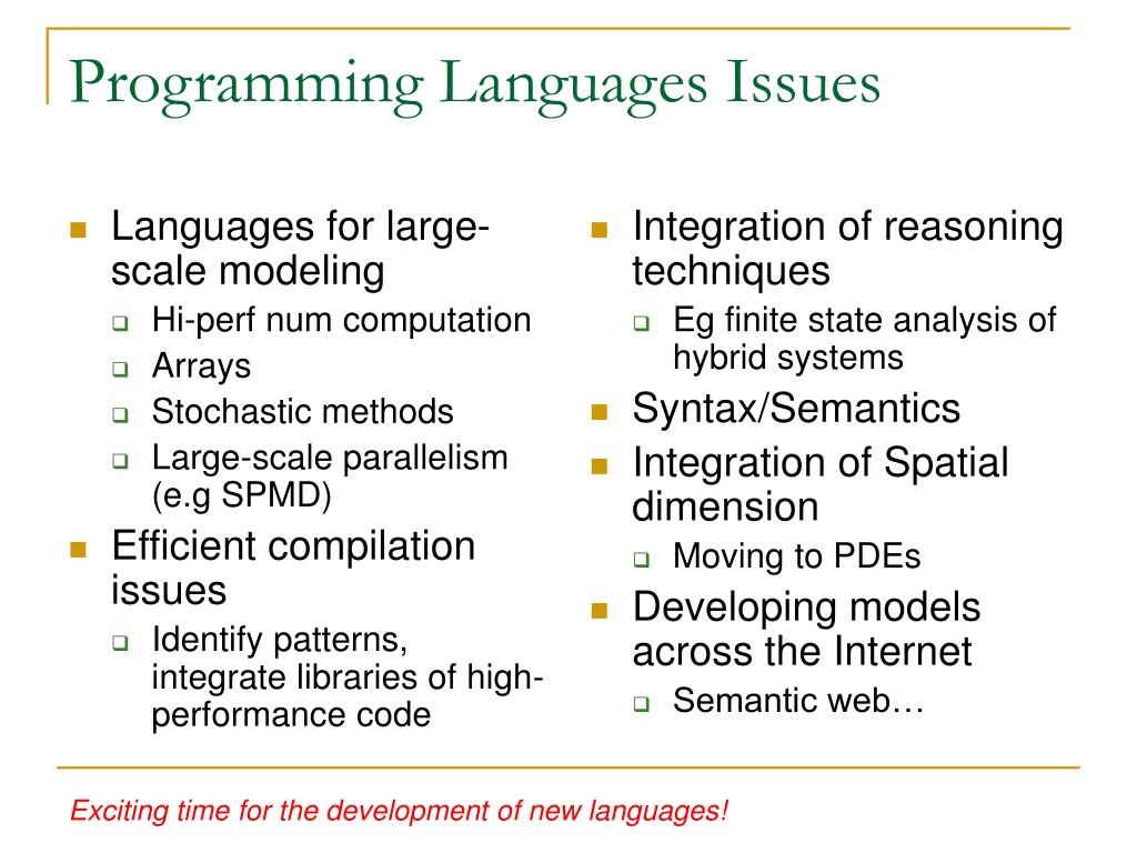 Languages for large-scale modeling Hi-perf num computation Arrays Stochastic methods Large-scale parallelism (e.g SPMD) Efficient compilation issues Identify patterns, integrate libraries of high-performance code Integration of reasoning techniques Eg finite state analysis of hybrid systems Syntax/Semantics Integration of Spatial dimension Moving to PDEs Developing models across the Internet Semantic web… Programming Languages Issues Exciting time for the development of new languages!