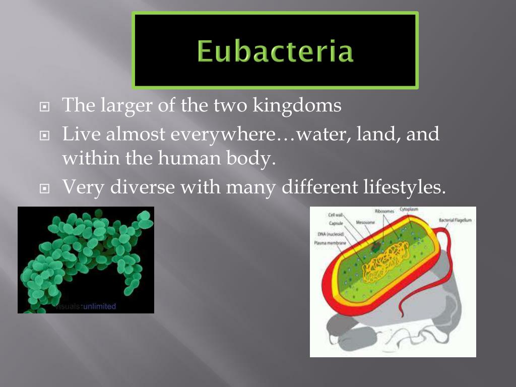 Eubacteria • The larger of the two kingdoms • Live almost everywhere…water, land, and within the human body. • Very diverse with many different lifestyles.