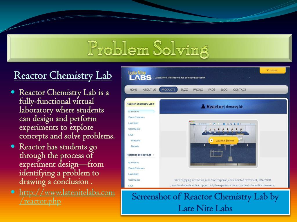 Problem Solving Reactor Chemistry Lab Screenshot of Reactor Chemistry Lab by Late Nite Labs • Reactor Chemistry Lab is a fully-functional virtual laboratory where students can design and perform experiments to explore concepts and solve problems. • Reactor has students go through the process of experiment design—from identifying a problem to drawing a conclusion . • http://www.latenitelabs.com/reactor.php