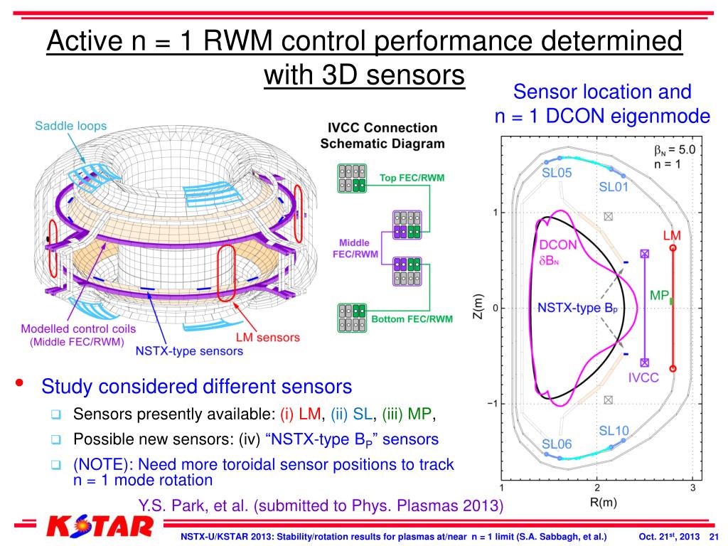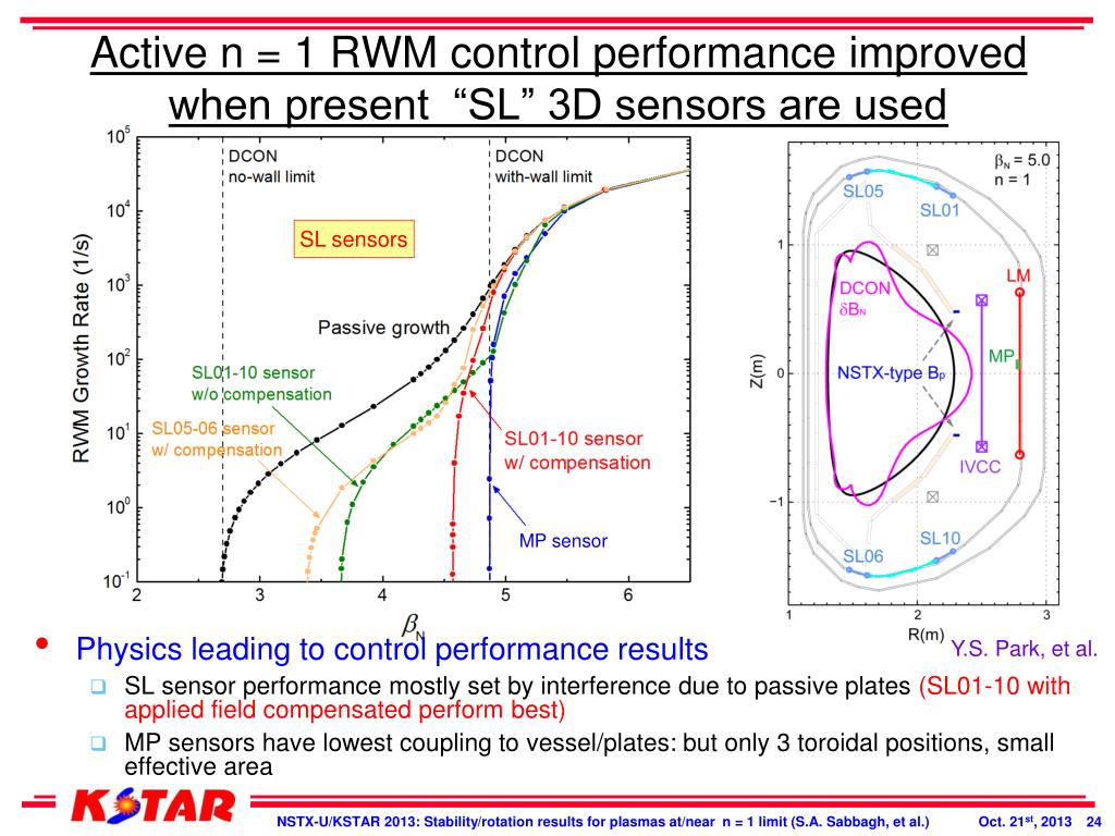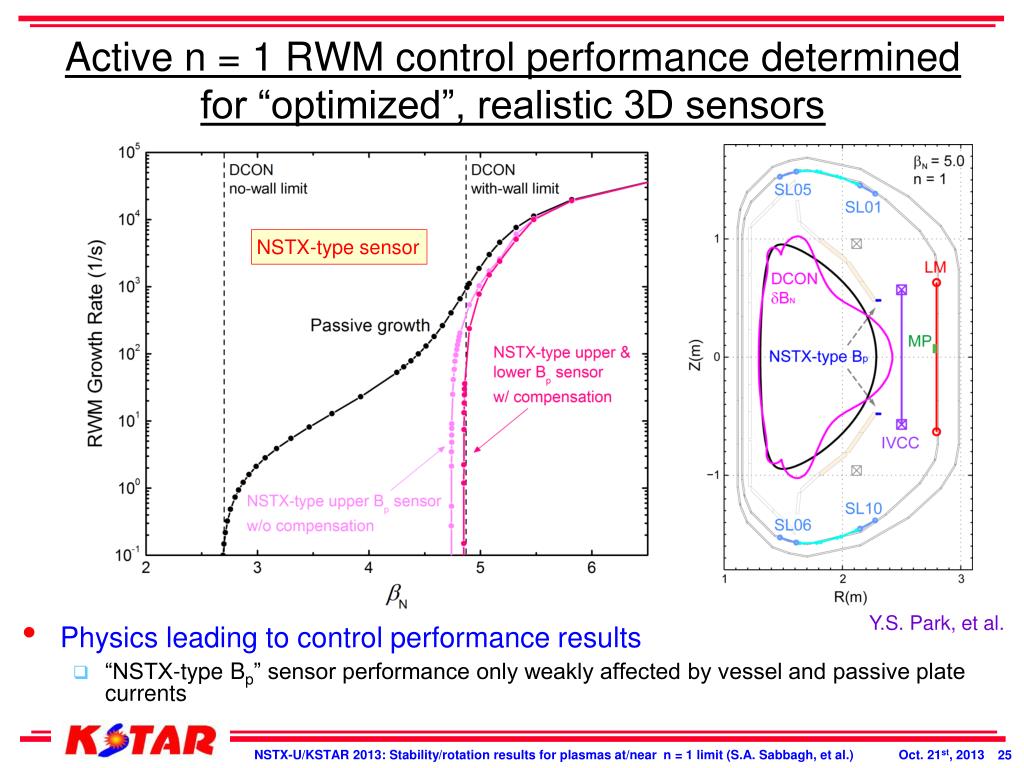 Active n = 1 RWM control performance improved when present “SL” 3D sensors are used • Physics leading to control performance results • SL sensor performance mostly set by interference due to passive plates (SL01-10 with applied field compensated perform best) • MP sensors have lowest coupling to vessel/plates: but only 3 toroidal positions, small effective area SL sensors MP sensor Y.S. Park, et al.
