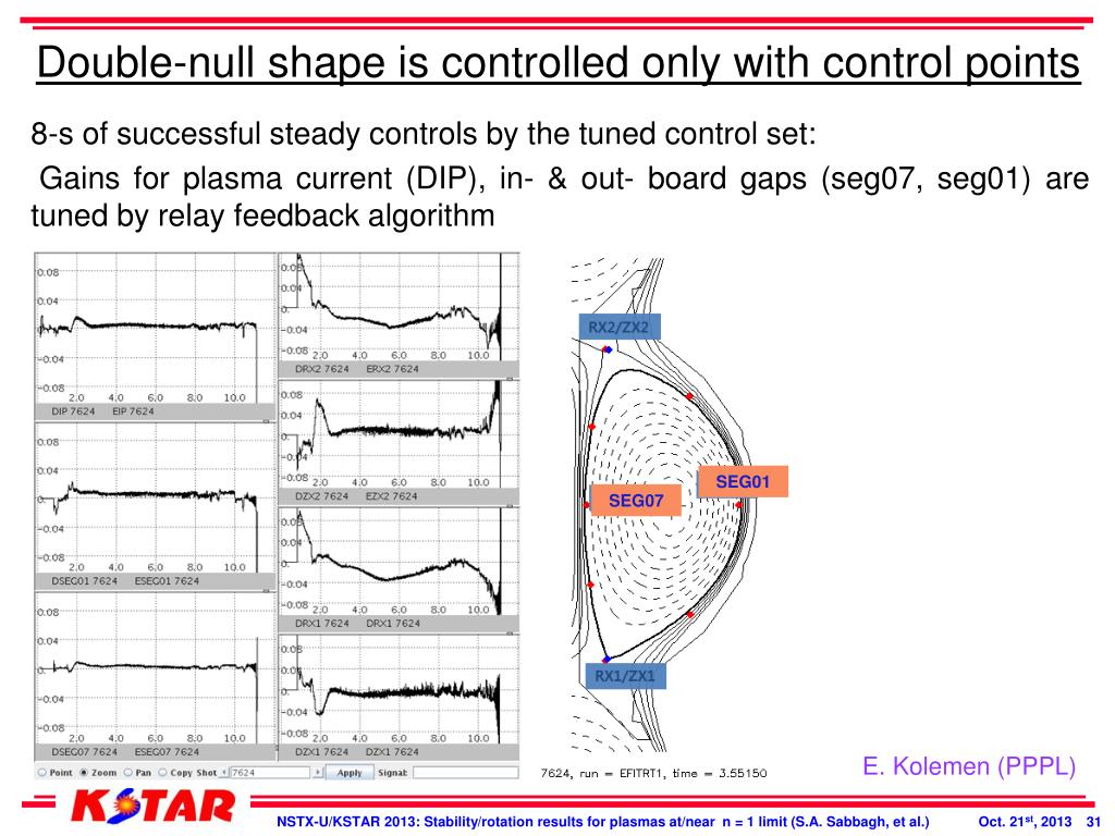 Double-null shape is controlled only with control points 8-s of successful steady controls by the tuned control set: Gains for plasma current (DIP), in- & out- board gaps (seg07, seg01) are tuned by relay feedback algorithm SEG01 SEG07 E. Kolemen (PPPL)