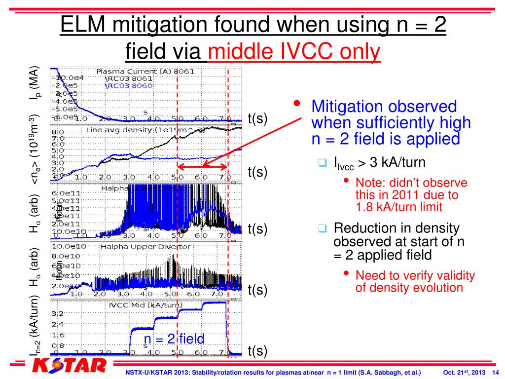 ELM mitigation found when using n = 2 field via middle IVCC only • Mitigation observed when sufficiently high n = 2 field is applied • IIvcc > 3 kA/turn • Note: didn’t observe this in 2011 due to 1.8 kA/turn limit • Reduction in density observed at start of n = 2 applied field • Need to verify validity of density evolution Ip (MA) t(s) <ne> (1019m-3) t(s) Ha (arb) t(s) Ha (arb) t(s) In=2 (kA/turn) n = 2 field t(s)