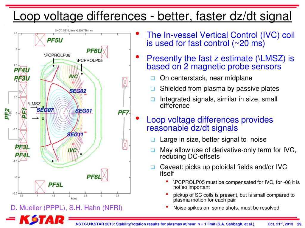 Loop voltage differences - better, faster dz/dt signal • The In-vessel Vertical Control (IVC) coil is used for fast control (~20 ms) • Presently the fast z estimate (\LMSZ) is based on 2 magnetic probe sensors • On centerstack, near midplane • Shielded from plasma by passive plates • Integrated signals, similar in size, small difference • Loop voltage differences provides reasonable dz/dt signals • Large in size, better signal to noise • May allow use of derivative-only term for IVC, reducing DC-offsets • Caveat: picks up poloidal fields and/or IVC itself • \PCPROLP05 must be compensated for IVC, for -06 it is not so important • pickup of SC coils is present, but is small compared to plasma motion for each pair • Noise spikes on some shots, must be resolved D. Mueller (PPPL), S.H. Hahn (NFRI)