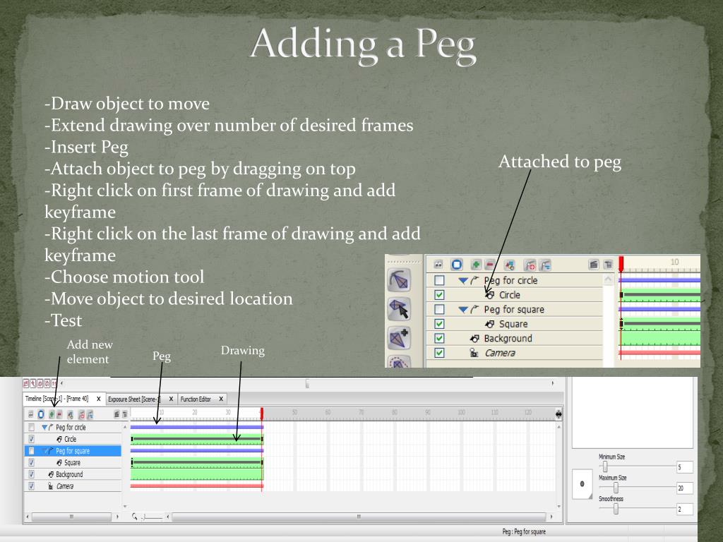 Adding a Peg • Draw object to move • Extend drawing over number of desired frames • Insert Peg • Attach object to peg by dragging on top • Right click on first frame of drawing and add keyframe • Right click on the last frame of drawing and add keyframe • Choose motion tool • Move object to desired location • Test Attached to peg Add new element Drawing Peg