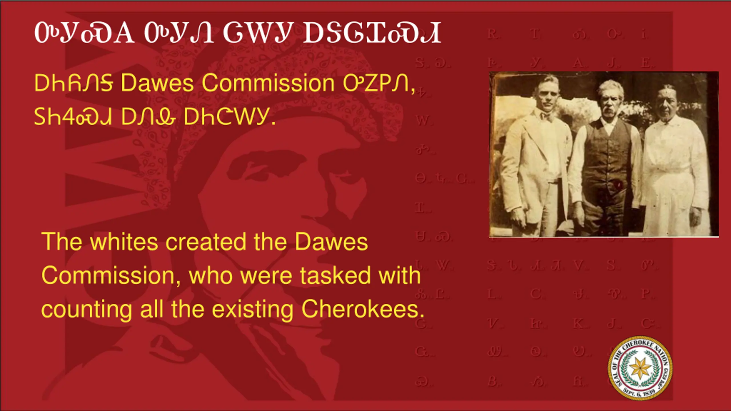 ᏅᎩᏍᎪ ᏅᎩᏁ ᏣᎳᎩ ᎠᏕᎶᏆᏍᏗ ᎠᏂᏲᏁᎦ Dawes Commission ᎤᏃᏢᏁ, ᏚᏂᏎᏍᏗ ᎠᏁᎲ ᎠᏂᏣᎳᎩ. The whites created the Dawes Commission, who were tasked with counting all the existing Cherokees.