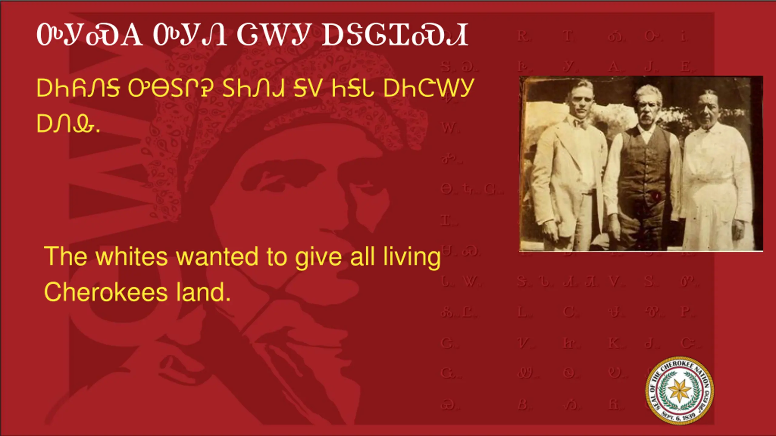 ᏅᎩᏍᎪ ᏅᎩᏁ ᏣᎳᎩ ᎠᏕᎶᏆᏍᏗ ᎠᏂᏲᏁᎦ ᎤᎾᏚᎵᎮ ᏚᏂᏁᏗ ᎦᏙ ᏂᎦᏓ ᎠᏂᏣᎳᎩ ᎠᏁᎲ. The whites wanted to give all living Cherokees land.