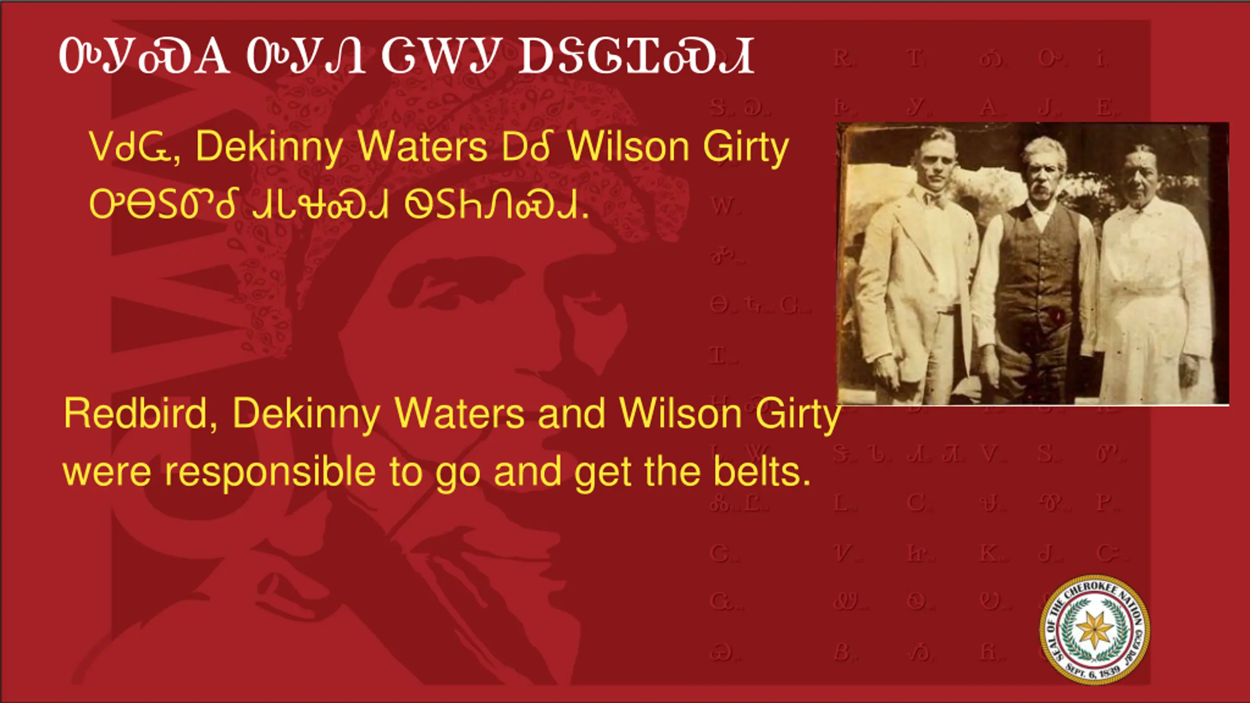 ᏅᎩᏍᎪ ᏅᎩᏁ ᏣᎳᎩ ᎠᏕᎶᏆᏍᏗ ᏙᏧᏩ, Dekinny Waters ᎠᎴ Wilson Girty ᎤᎾᏚᏛᎴ ᏗᏓᏠᏍᏗ ᏫᏚᏂᏁᏍᏗ. Redbird, Dekinny Waters and Wilson Girty were responsible to go and get the belts.