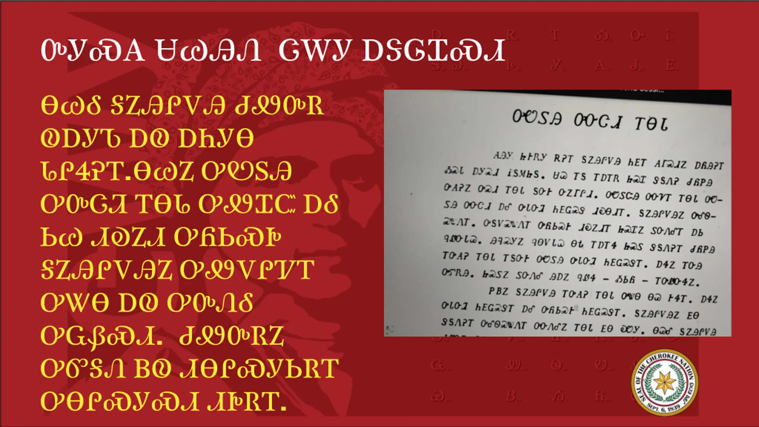 ᏅᎩᏍᎪ ᏅᎩᏁ ᏣᎳᎩ ᎠᏕᎶᏆᏍᏗ ᎠᏂᎦᏴᎳ ᎯᎠ ᏄᏂᏪᏎᎸ ᏙᏧᏩ ᏥᏙᎲᎴᏓ ᏣᎳᎩ ᎢᏳᎾᏛᏂᏗ ᏥᎦᎶᏐᎲᏍᎩ. The elders said this to Redbird, “Raise up the Cherokee ways that are leaving.