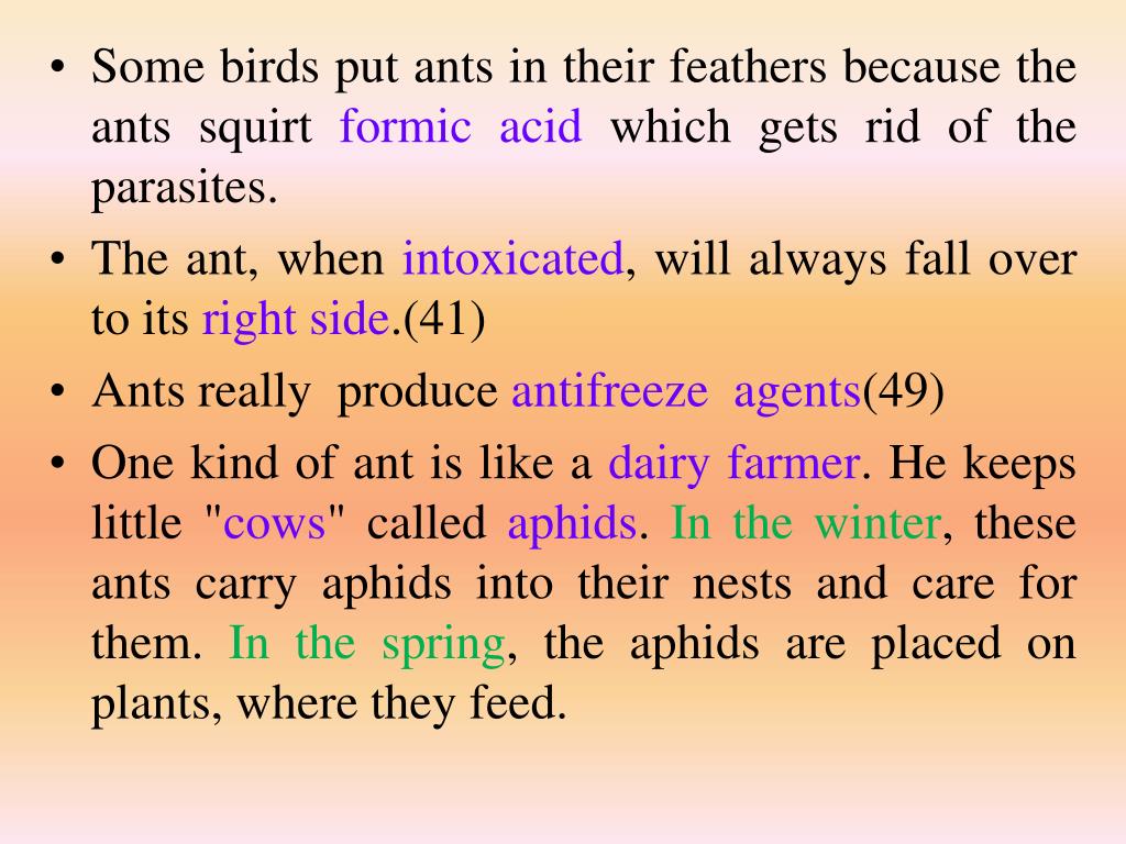 Some birds put ants in their feathers because the ants squirt formic acid which gets rid of the parasites. The ant, when intoxicated, will always fall over to its right side.(41) Ants really produce antifreeze agents(49) One kind of ant is like a dairy farmer. He keeps little "cows" called aphids. In the winter, these ants carry aphids into their nests and care for them. In the spring, the aphids are placed on plants, where they feed.