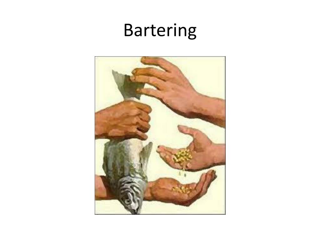 Barter • Verb- To exchangeone thing or service for another without the use of money • Example: In remote parts of the country, people bartered vegetables for tools.