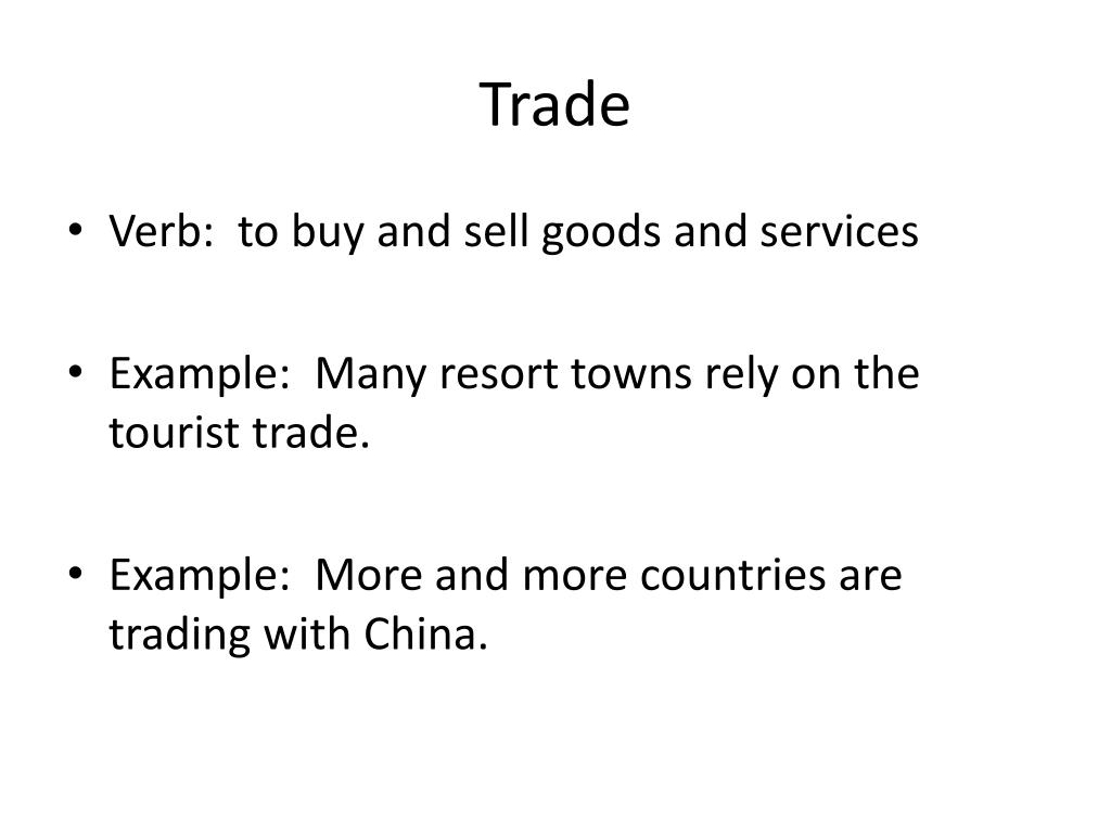 Trade • Verb: to buy and sell goods and services • Example: Many resort towns rely on the tourist trade. • Example: More and more countries are trading with China.