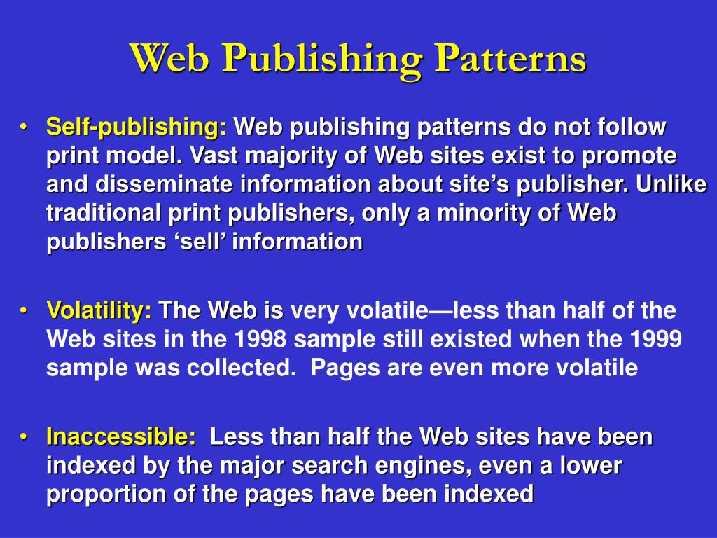 Web Publishing Patterns • Self-publishing: Web publishing patterns do not follow print model. Vast majority of Web sites exist to promote and disseminate information about site’s publisher. Unlike traditional print publishers, only a minority of Web publishers ‘sell’ information • Volatility: The Web is very volatile—less than half of the Web sites in the 1998 sample still existed when the 1999 sample was collected. Pages are even more volatile • Inaccessible: Less than half the Web sites have been indexed by the major search engines, even a lower proportion of the pages have been indexed
