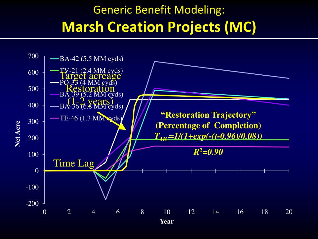 Target acreage Restoration (1-2 years) “Restoration Trajectory” (Percentage of Completion)TMC=1/(1+exp(-(t-0.96)/0.08)) R2=0.90 Time Lag Generic Benefit Modeling: Marsh Creation Projects (MC)