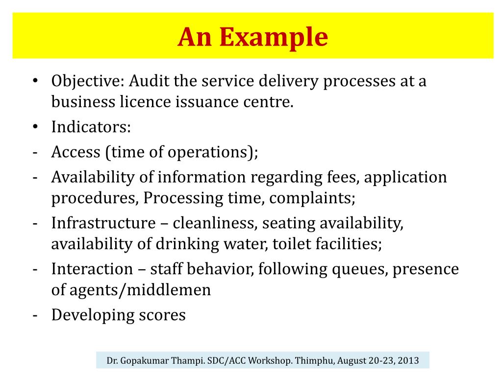 An Example • Objective: Audit the service delivery processes at a business licence issuance centre. • Indicators: • Access (time of operations); • Availability of information regarding fees, application procedures, Processing time, complaints; • Infrastructure – cleanliness, seating availability, availability of drinking water, toilet facilities; • Interaction – staff behavior, following queues, presence of agents/middlemen • Developing scores Dr. Gopakumar Thampi. SDC/ACC Workshop. Thimphu, August 20-23, 2013
