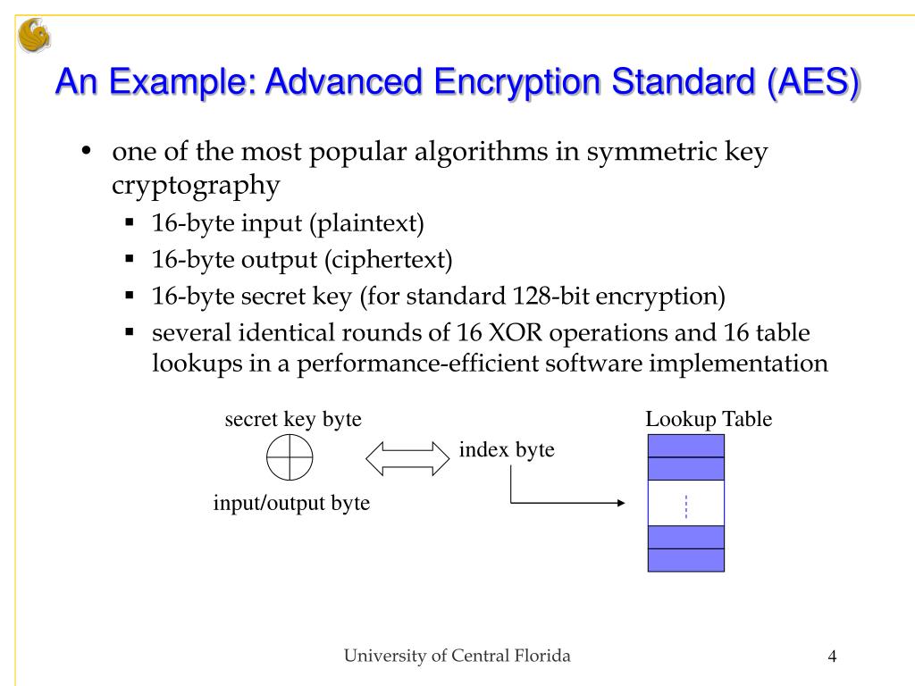 An Example: Advanced Encryption Standard (AES) • one of the most popular algorithms in symmetric key cryptography • 16-byte input (plaintext) • 16-byte output (ciphertext) • 16-byte secret key (for standard 128-bit encryption) • several identical rounds of 16 XOR operations and 16 table lookups in a performance-efficient software implementation secret key byte Lookup Table index byte input/output byte University of Central Florida