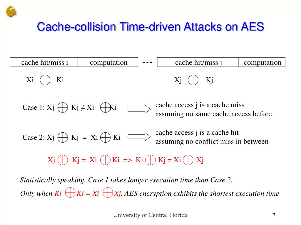 Cache-collision Time-driven Attacks on AES cache hit/miss i computation cache hit/miss j computation Xi Ki Xj Kj cache access j is a cache miss assuming no same cache access before Case 1: Xj Kj ≠ Xi Ki cache access j is a cache hit assuming no conflict miss in between Case 2: Xj Kj = Xi Ki Xj Kj = Xi Ki => Ki Kj = Xi Xj Statistically speaking, Case 1 takes longer execution time than Case 2. Only when Ki Kj = Xi Xj, AES encryption exhibits the shortest execution time University of Central Florida