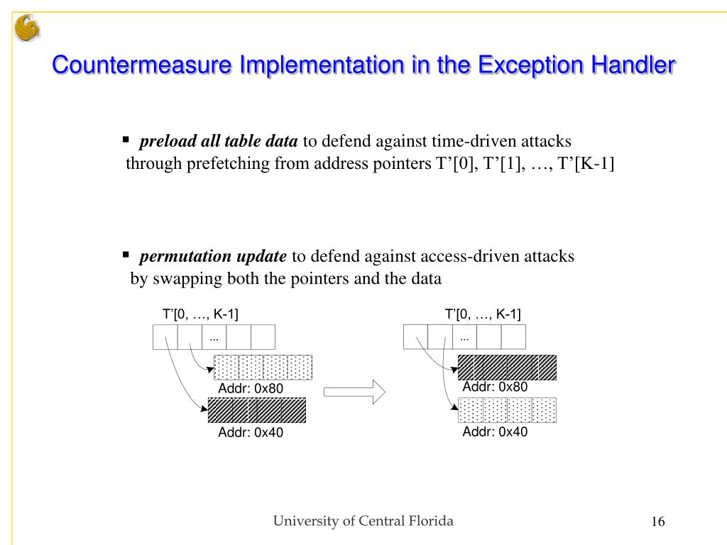 Countermeasure Implementation in the Exception Handler • preload all table data to defend against time-driven attacks through prefetching from address pointers T’[0], T’[1], …, T’[K-1] • permutation update to defend against access-driven attacks by swapping both the pointers and the data University of Central Florida