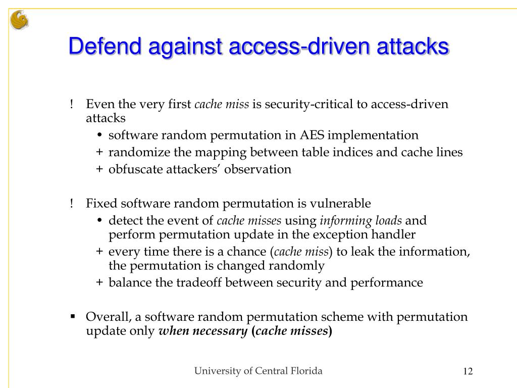Defend against access-driven attacks • Even the very first cache miss is security-critical to access-driven attacks • software random permutation in AES implementation • randomize the mapping between table indices and cache lines • obfuscate attackers’ observation • Fixed software random permutation is vulnerable • detect the event of cache misses using informing loads and perform permutation update in the exception handler • every time there is a chance (cache miss) to leak the information, the permutation is changed randomly • balance the tradeoff between security and performance • Overall, a software random permutation scheme with permutation update only when necessary (cache misses) University of Central Florida