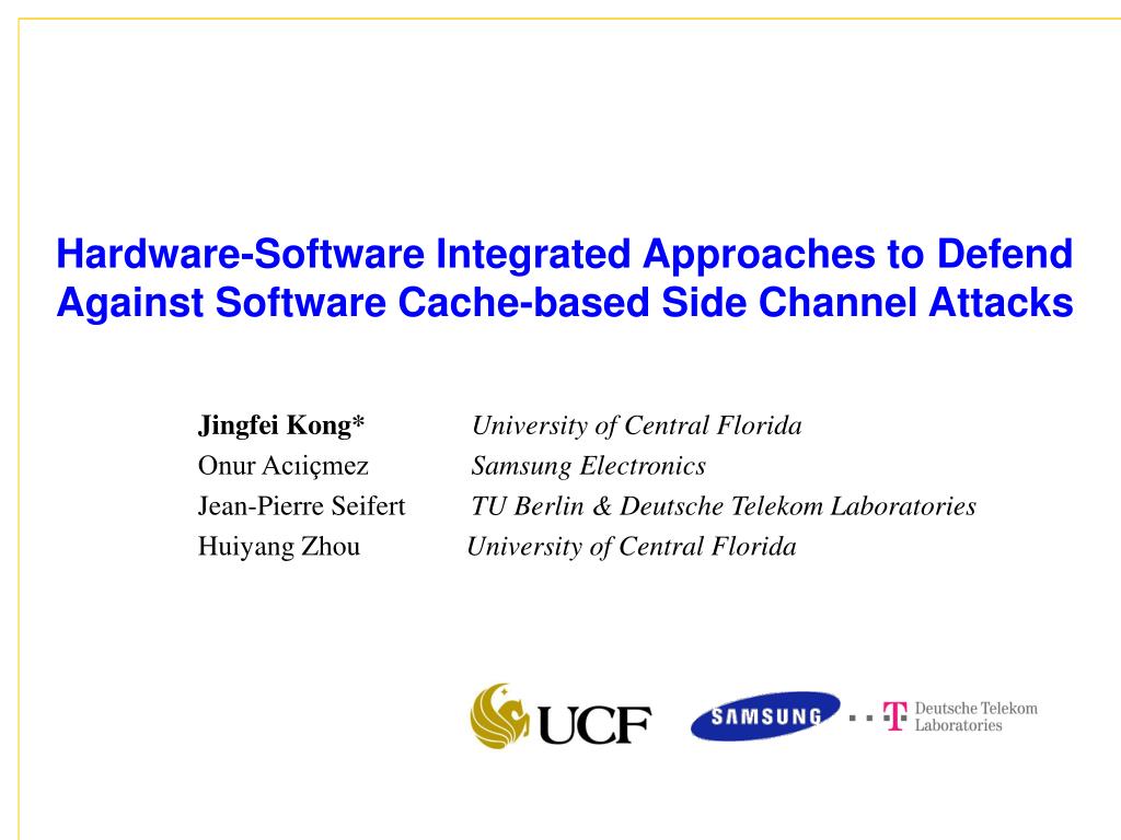 Hardware-Software Integrated Approaches to Defend Against Software Cache-based Side Channel Attacks Jingfei Kong*University of Central Florida Onur Acıiçmez Samsung Electronics Jean-Pierre Seifert TU Berlin & Deutsche Telekom Laboratories Huiyang Zhou University of Central Florida