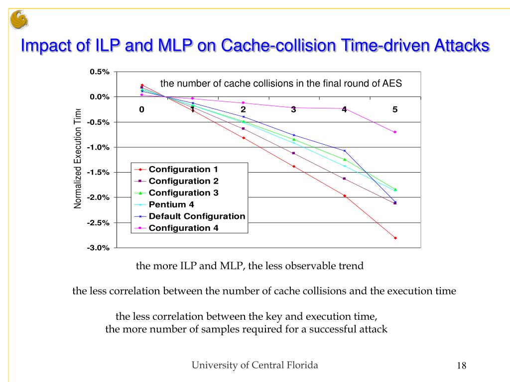 Impact of ILP and MLP on Cache-collision Time-driven Attacks the number of cache collisions in the final round of AES the more ILP and MLP, the less observable trend the less correlation between the number of cache collisions and the execution time the less correlation between the key and execution time, the more number of samples required for a successful attack University of Central Florida
