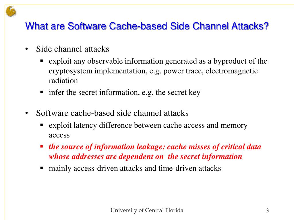 What are Software Cache-based Side Channel Attacks? • Side channel attacks • exploit any observable information generated as a byproduct of the cryptosystem implementation, e.g. power trace, electromagnetic radiation • infer the secret information, e.g. the secret key • Software cache-based side channel attacks • exploit latency difference between cache access and memory access • the source of information leakage: cache misses of critical data whose addresses are dependent on the secret information • mainly access-driven attacks and time-driven attacks University of Central Florida