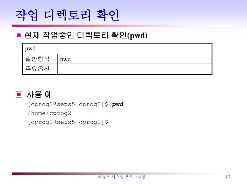 작업 디렉토리 확인 • 현재 작업중인 디렉토리 확인(pwd) • 사용 예 [cprog2@seps5 cprog2]$ pwd /home/cprog2 [cprog2@seps5 cprog2]$
