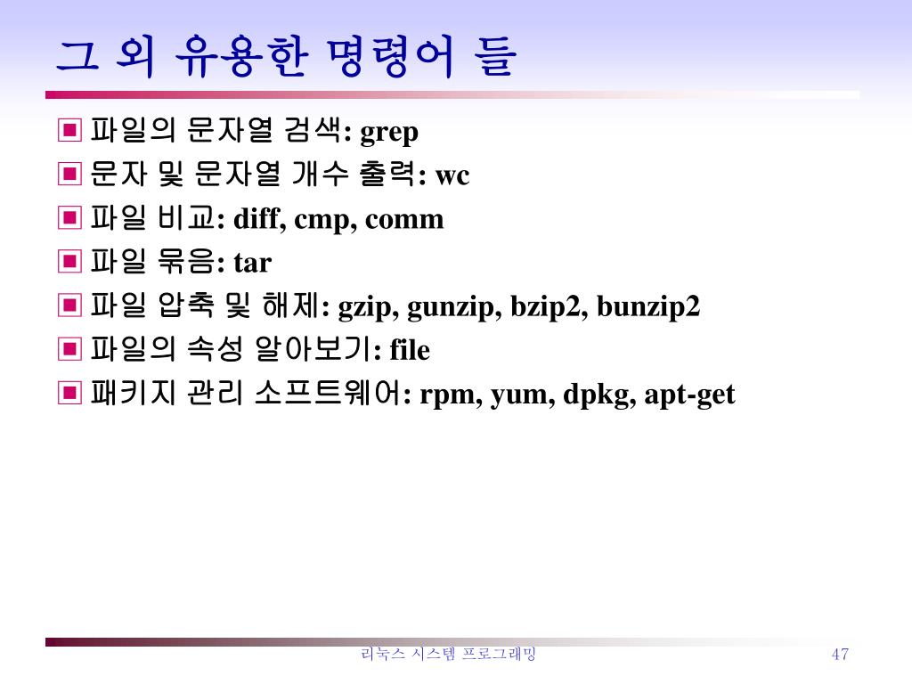 그 외 유용한 명령어 들 • 파일의 문자열 검색: grep • 문자 및 문자열 개수 출력: wc • 파일 비교: diff, cmp, comm • 파일 묶음: tar • 파일 압축 및 해제: gzip, gunzip, bzip2, bunzip2 • 파일의 속성 알아보기: file • 패키지 관리 소프트웨어: rpm, yum, dpkg, apt-get