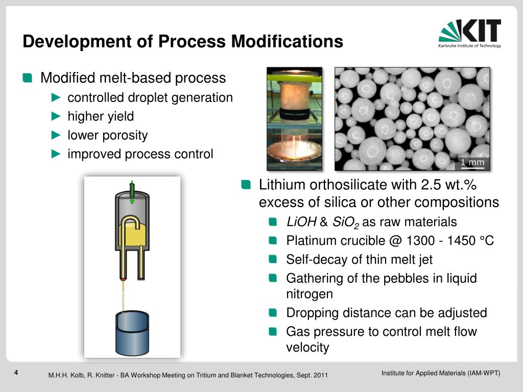 Development of Process Modifications • Lithium orthosilicate with 2.5 wt.% excess of silica or other compositions • LiOH & SiO2 as raw materials • Platinum crucible @ 1300 - 1450 °C • Self-decay of thin melt jet • Gathering of the pebbles in liquid nitrogen • Dropping distance can be adjusted • Gas pressure to control melt flow velocity • Modified melt-based process • controlled droplet generation • higher yield • lower porosity • improved process control M.H.H. Kolb, R. Knitter - BA Workshop Meeting on Tritium and Blanket Technologies, Sept. 2011