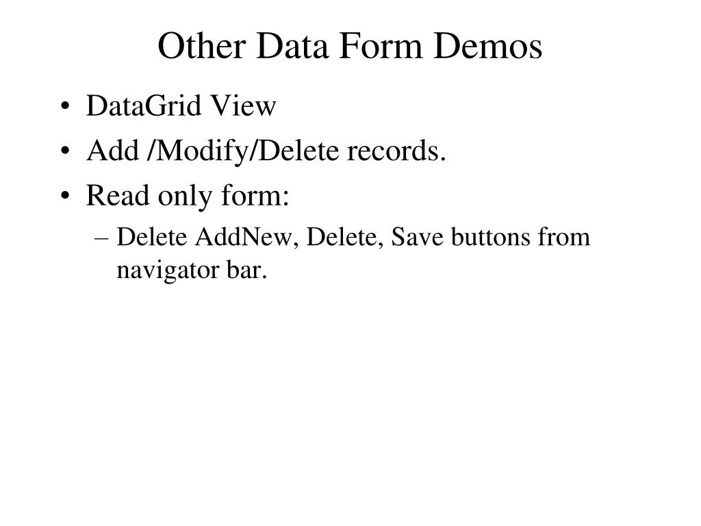 Other Data Form Demos • DataGrid View • Add /Modify/Delete records. • Read only form: • Delete AddNew, Delete, Save buttons from navigator bar.