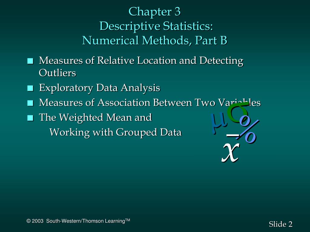 % x Chapter 3 Descriptive Statistics: Numerical Methods, Part B • Measures of Relative Location and Detecting Outliers • Exploratory Data Analysis • Measures of Association Between Two Variables • The Weighted Mean and Working with Grouped Data