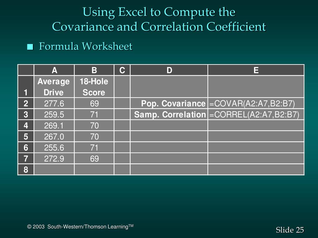 Using Excel to Compute theCovariance and Correlation Coefficient • Formula Worksheet