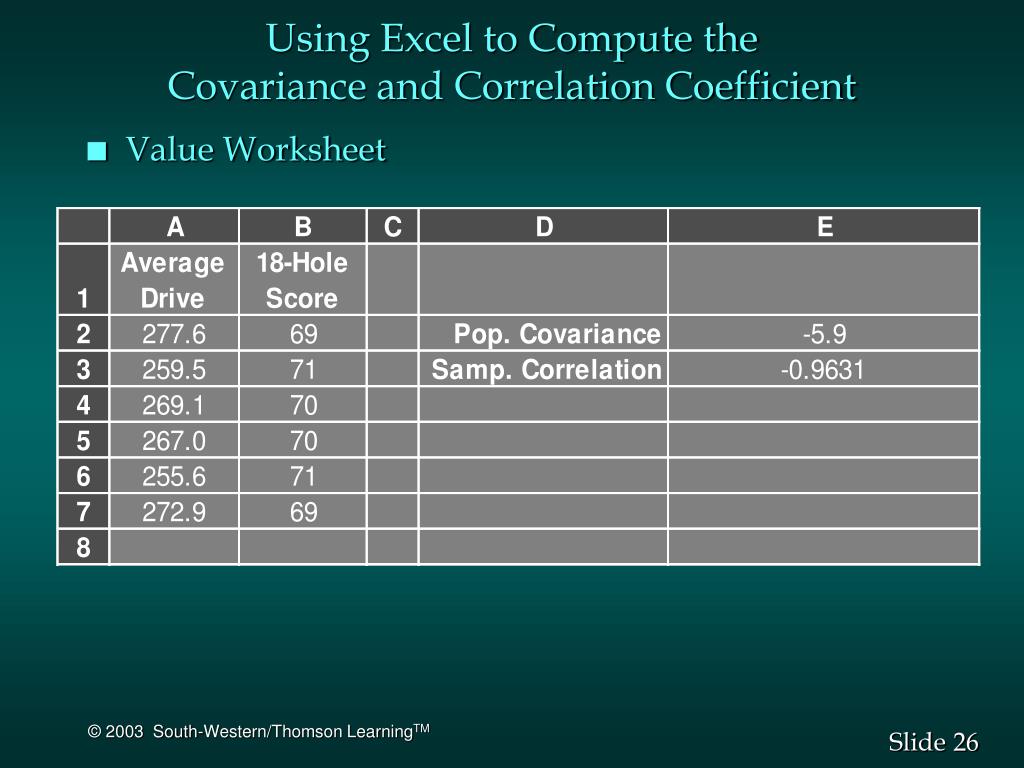 Using Excel to Compute theCovariance and Correlation Coefficient • Value Worksheet