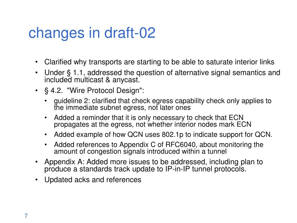 changes in draft-02 • Clarified why transports are starting to be able to saturate interior links • Under § 1.1, addressed the question of alternative signal semantics and included multicast & anycast. • § 4.2. "Wire Protocol Design": • guideline 2: clarified that check egress capability check only applies to the immediate subnet egress, not later ones • Added a reminder that it is only necessary to check that ECN propagates at the egress, not whether interior nodes mark ECN • Added example of how QCN uses 802.1p to indicate support for QCN. • Added references to Appendix C of RFC6040, about monitoring the amount of congestion signals introduced within a tunnel • Appendix A: Added more issues to be addressed, including plan to produce a standards track update to IP-in-IP tunnel protocols. • Updated acks and references