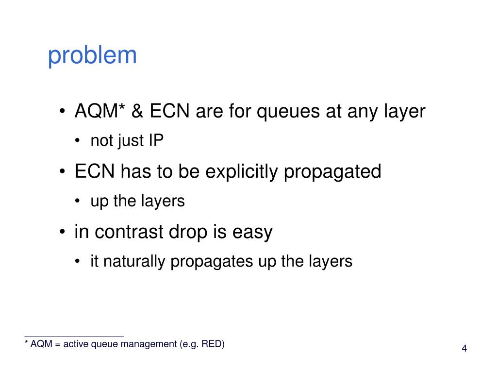 problem • AQM* & ECN are for queues at any layer • not just IP • ECN has to be explicitly propagated • up the layers • in contrast drop is easy • it naturally propagates up the layers * AQM = active queue management (e.g. RED)