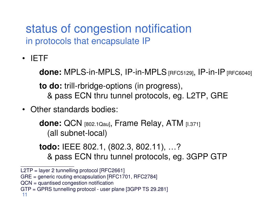 status of congestion notificationin protocols that encapsulate IP • IETF done: MPLS-in-MPLS, IP-in-MPLS [RFC5129], IP-in-IP [RFC6040] to do: trill-rbridge-options (in progress), & pass ECN thru tunnel protocols, eg. L2TP, GRE • Other standards bodies: done: QCN [802.1Qau], Frame Relay, ATM [I.371](all subnet-local) todo: IEEE 802.1, (802.3, 802.11), …?& pass ECN thru tunnel protocols, eg. 3GPP GTP L2TP = layer 2 tunnelling protocol [RFC2661] GRE = generic routing encapsulation [RFC1701, RFC2784] QCN = quantised congestion notification GTP = GPRS tunnelling protocol - user plane [3GPP TS 29.281]