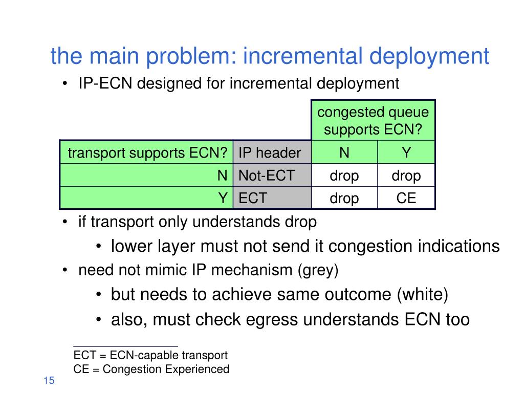 the main problem: incremental deployment • IP-ECN designed for incremental deployment • if transport only understands drop • lower layer must not send it congestion indications • need not mimic IP mechanism (grey) • but needs to achieve same outcome (white) • also, must check egress understands ECN too ECT = ECN-capable transport CE = Congestion Experienced