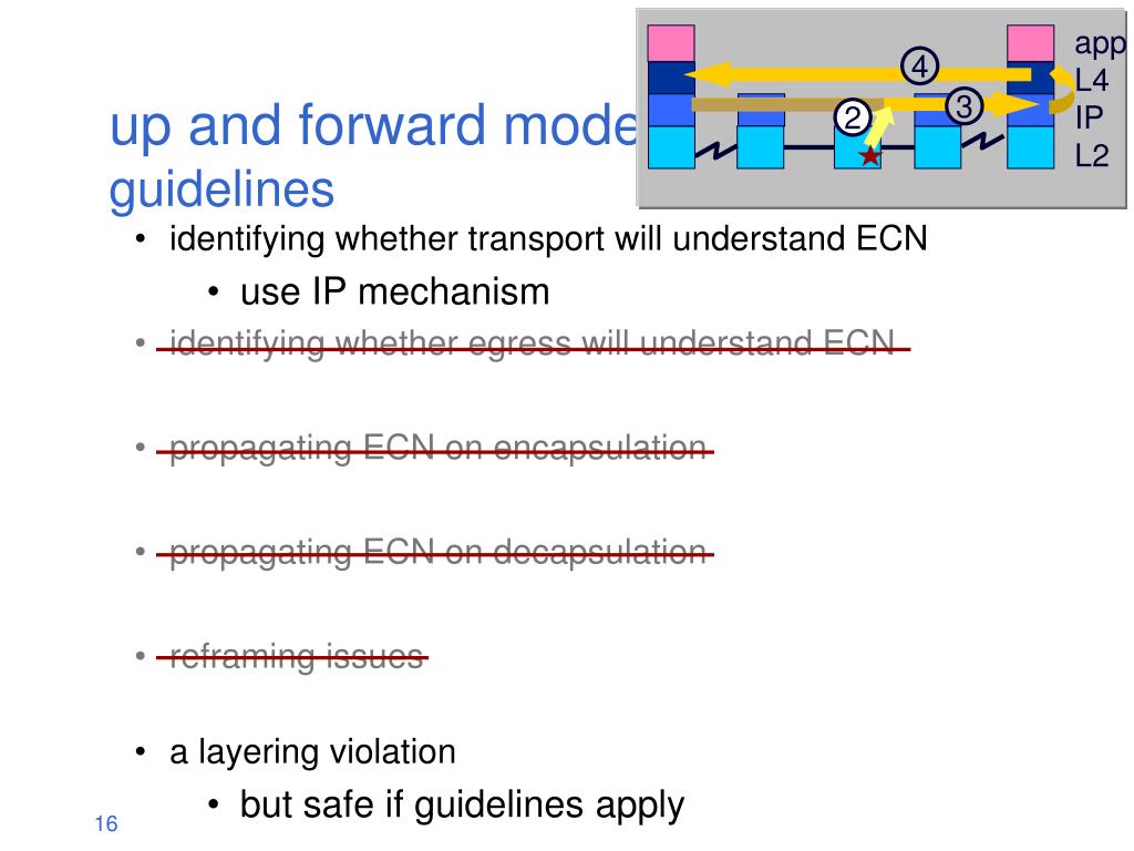 app L4 IP L2 4 3 up and forward modeguidelines 2 • identifying whether transport will understand ECN • use IP mechanism • identifying whether egress will understand ECN • propagating ECN on encapsulation • propagating ECN on decapsulation • reframing issues • a layering violation • but safe if guidelines apply