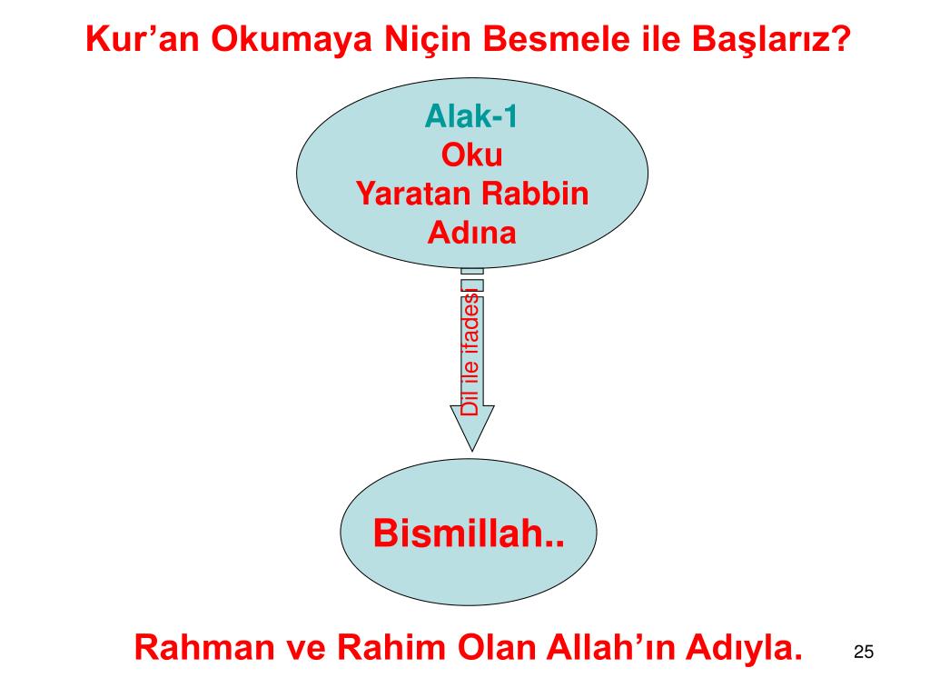 Kur’an Okumaya Niçin Besmele ile Başlarız? Alak-1 Oku Yaratan Rabbin Adına • Dil ile ifadesi Bismillah.. Rahman ve Rahim Olan Allah’ın Adıyla.