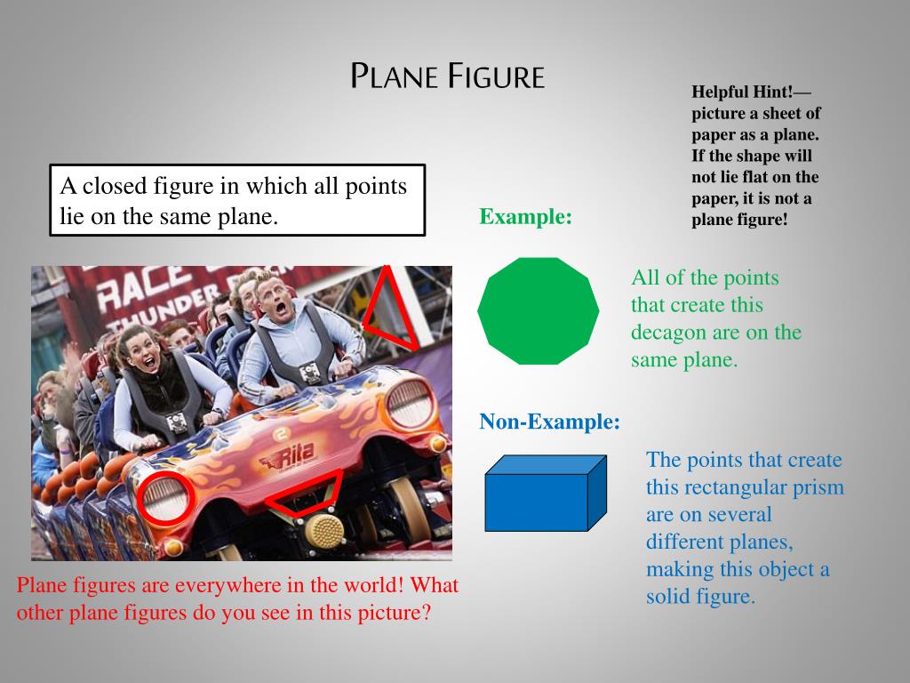 Plane Figure Helpful Hint!—picture a sheet of paper as a plane. If the shape will not lie flat on the paper, it is not a plane figure! A closed figure in which all points lie on the same plane. Example: All of the points that create this decagon are on the same plane. Non-Example: The points that create this rectangular prism are on several different planes, making this object a solid figure. Plane figures are everywhere in the world! What other plane figures do you see in this picture?