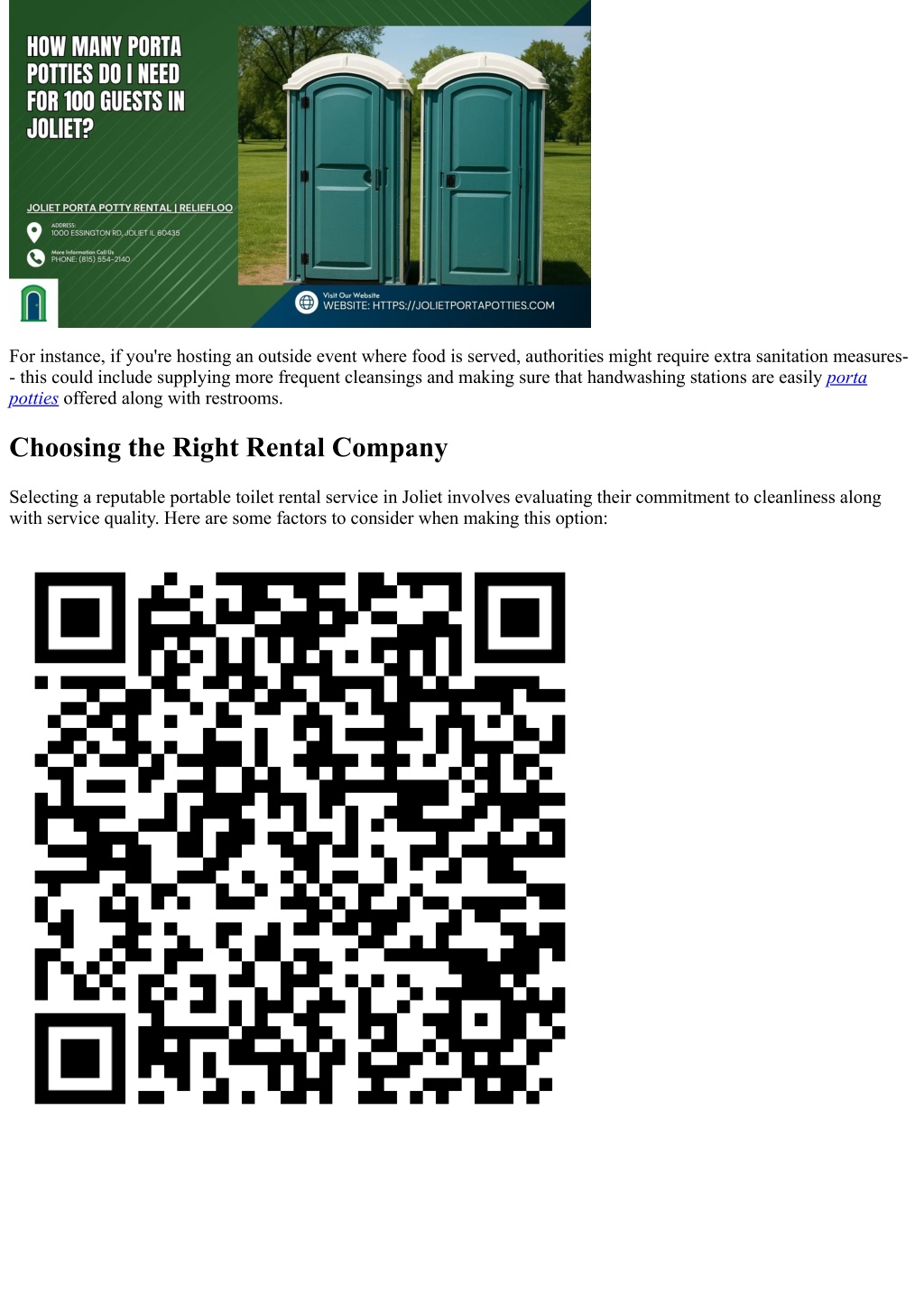 Joliet Porta Potty Rental ReliefLoo, 1000 Essington Rd, Joliet IL 60435, (815) 554-2140 Renting portable toilets is often an ignored aspect of event preparation and building projects. In a city like Joliet, Illinois, where outdoor gatherings, celebrations, and building and construction are commonplace, guaranteeing that these facilities are clean and well-maintained surpasses simple benefit. It speaks to the total quality of the event or job and impacts the experience of guests or workers. Tidiness in portable restroom rentals influences not simply hygiene but likewise public understanding and satisfaction. The Role of Cleanliness in Portable Toilet Rentals When thinking about a porta potty rental service in Joliet, cleanliness must be your top priority. Picture going to a festival where the sanitation centers are dirty or improperly maintained. It can sour the entire experience. Whether you're organizing a wedding event at a scenic park or handling a large construction site, the state of your portable washrooms can leave a long lasting impression. First impressions matter deeply. Visitors or workers experiencing unkempt facilities may feel that their health is jeopardized, which can cause grievances and even unfavorable evaluations online. On the other hand, if the bathrooms are gleaming tidy with fresh products, it joliet portable restroom rental Joliet Porta Potty Rental ReliefLoo shows well on the host's attention to information and dedication to comfort. Joliet Porta Potty Rental ReliefLoo’s Podcast How Much Does It Cost To Rent One… Why Cleanliness Impacts Health Portable toilets are naturally susceptible to odors and germs due to their confined areas. Keeping them tidy is not just about aesthetics; it's important for health factors too. If sanitation requirements are disregarded, hazardous germs from human waste can multiply, causing potential infections or illness among users. A trusted portable restroom rental company near Joliet will prioritize tidiness by using systematic cleaning protocols. This often consists of regular servicing throughout events-- refilling products like toilet paper and hand sanitizer-- and deep cleaning before delivery to make sure that every system fulfills high standards. Understanding Local Regulations Illinois has specific regulations regarding sanitation at public events that include utilizing portable toilets. These standards highlight the significance of keeping hygienic conditions for user safety. Acquainting yourself with local laws helps guarantee compliance when leasing portable restrooms for events in Joliet.