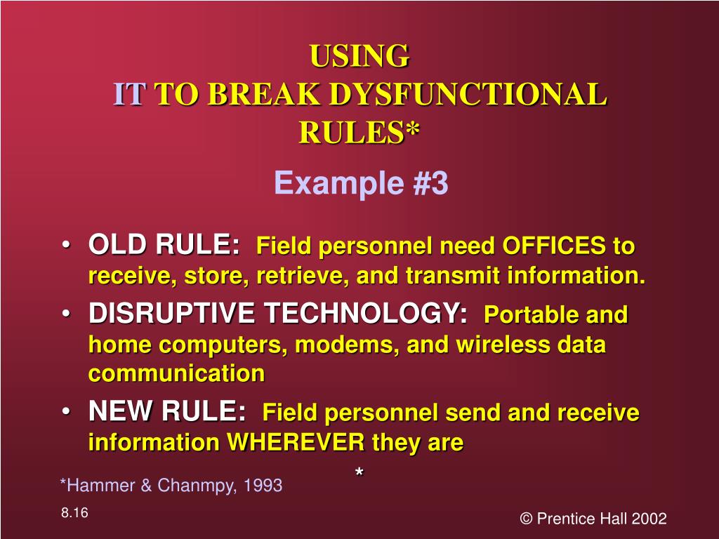 USING IT TO BREAK DYSFUNCTIONAL RULES* • OLD RULE: Field personnel need OFFICES to receive, store, retrieve, and transmit information. • DISRUPTIVE TECHNOLOGY: Portable and home computers, modems, and wireless data communication • NEW RULE: Field personnel send and receive information WHEREVER they are * Example #3 *Hammer & Chanmpy, 1993