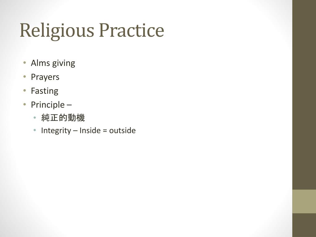 Religious Practice • Alms giving • Prayers • Fasting • Principle – • 純正的動機 • Integrity – Inside = outside