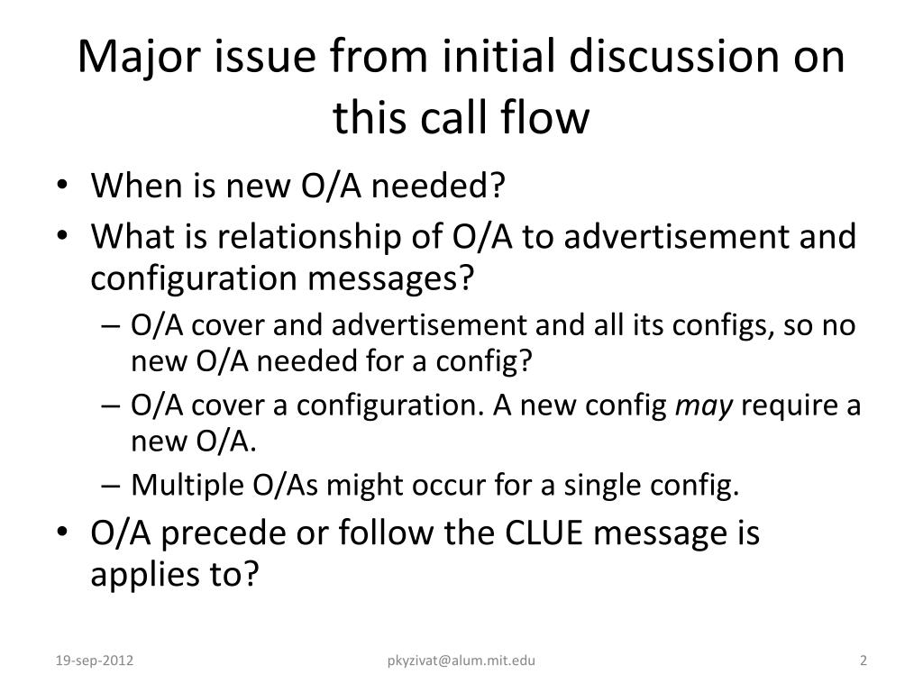 Major issue from initial discussion on this call flow • When is new O/A needed? • What is relationship of O/A to advertisement and configuration messages? • O/A cover and advertisement and all its configs, so no new O/A needed for a config? • O/A cover a configuration. A new configmay require a new O/A. • Multiple O/As might occur for a single config. • O/A precede or follow the CLUE message is applies to? pkyzivat@alum.mit.edu