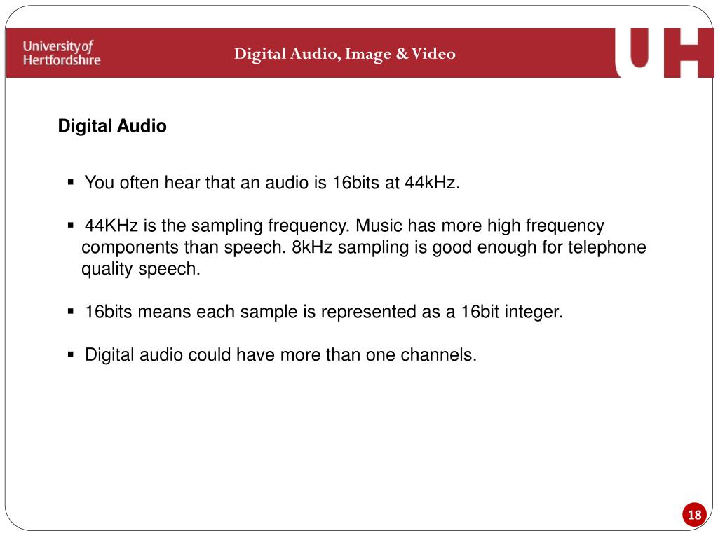 Digital Audio, Image & Video Digital Audio • You often hear that an audio is 16bits at 44kHz. • 44KHz is the sampling frequency. Music has more high frequency • components than speech. 8kHz sampling is good enough for telephone • quality speech. • 16bits means each sample is represented as a 16bit integer. • Digital audio could have more than one channels.