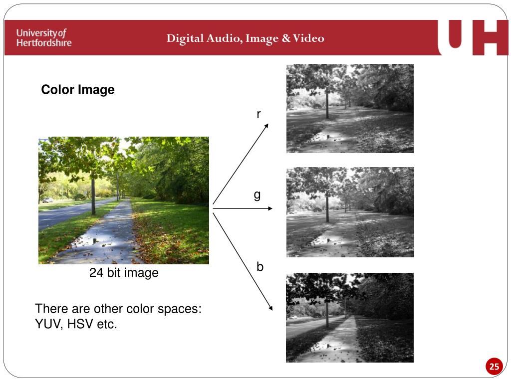 Digital Audio, Image & Video Color Image r g b 24 bit image There are other color spaces: YUV, HSV etc.