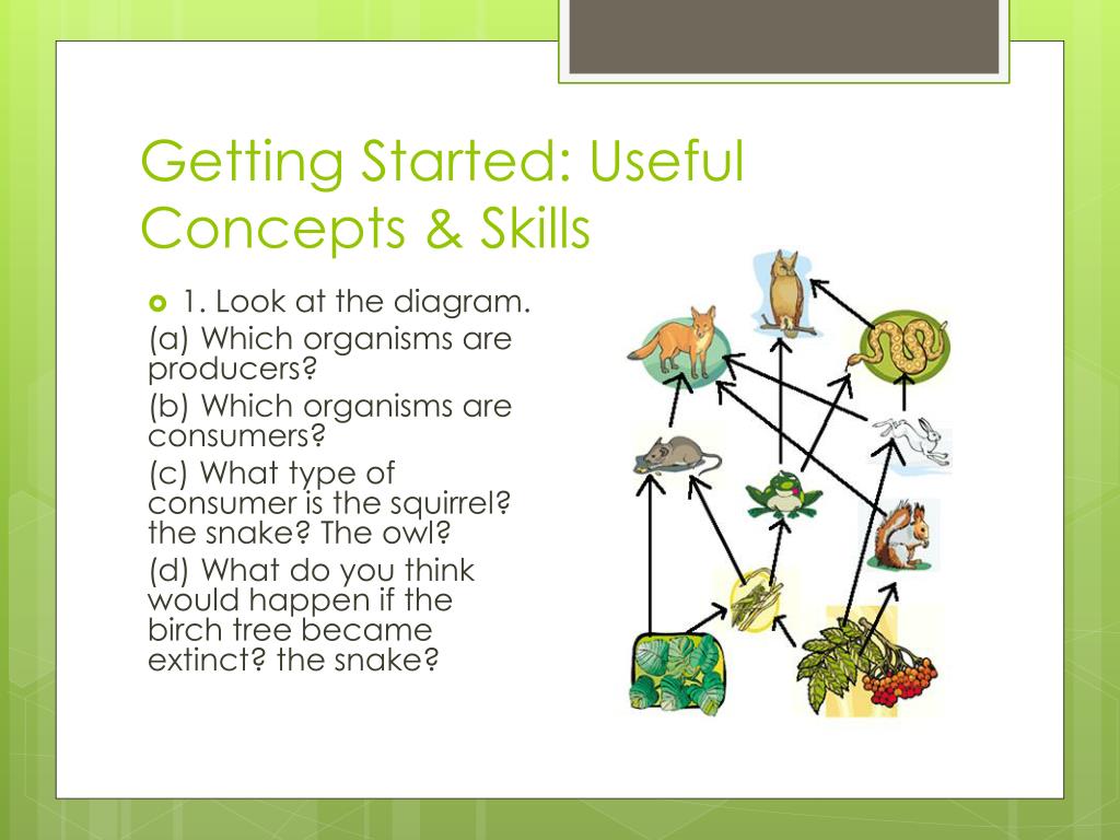 Getting Started: Useful Concepts & Skills • 1. Look at the diagram. (a) Which organisms are producers? (b) Which organisms are consumers? (c) What type of consumer is the squirrel? the snake? The owl? (d) What do you think would happen if the birch tree became extinct? the snake?