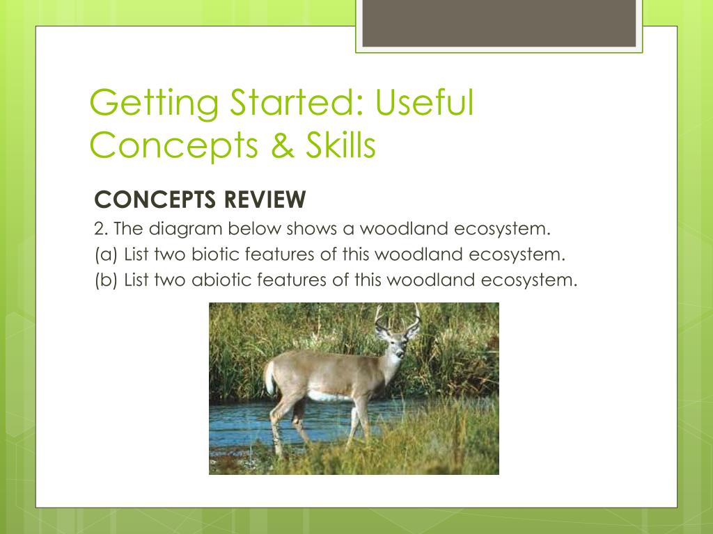 Getting Started: Useful Concepts & Skills CONCEPTS REVIEW 2. The diagram below shows a woodland ecosystem. (a) List two biotic features of this woodland ecosystem. (b) List two abiotic features of this woodland ecosystem.