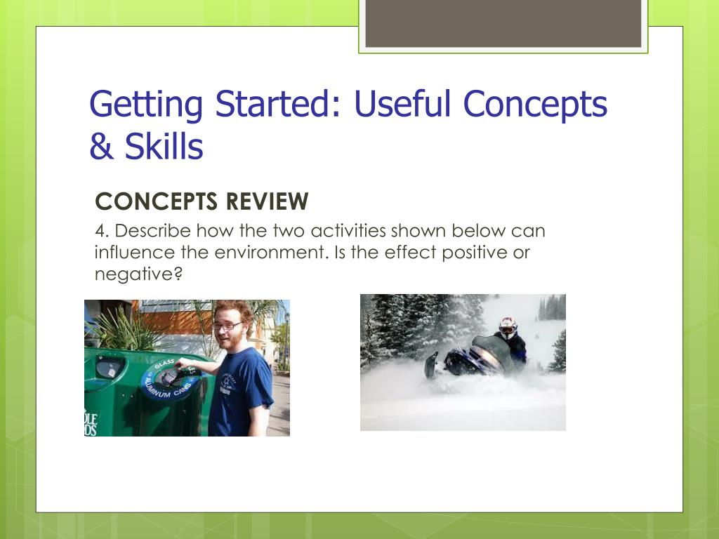 Getting Started: Useful Concepts & Skills CONCEPTS REVIEW 4. Describe how the two activities shown below can influence the environment. Is the effect positive or negative?