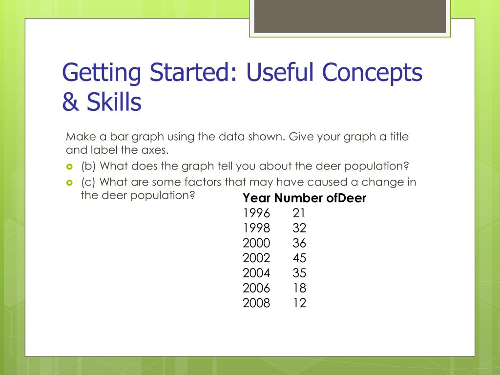 Getting Started: Useful Concepts & Skills Make a bar graph using the data shown. Give your graph a title and label the axes. • (b) What does the graph tell you about the deer population? • (c) What are some factors that may have caused a change in the deer population? YearNumberofDeer 1996 21 1998 32 2000 36 2002 45 2004 35 2006 18 2008 12